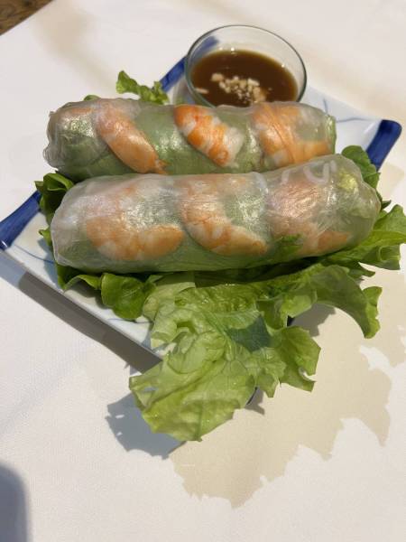 Rouleaux de printemps : crevette ; mélange de legume ; pousse de soja ; menthe ; surimi ; galette de riz ; sauce barbecue.